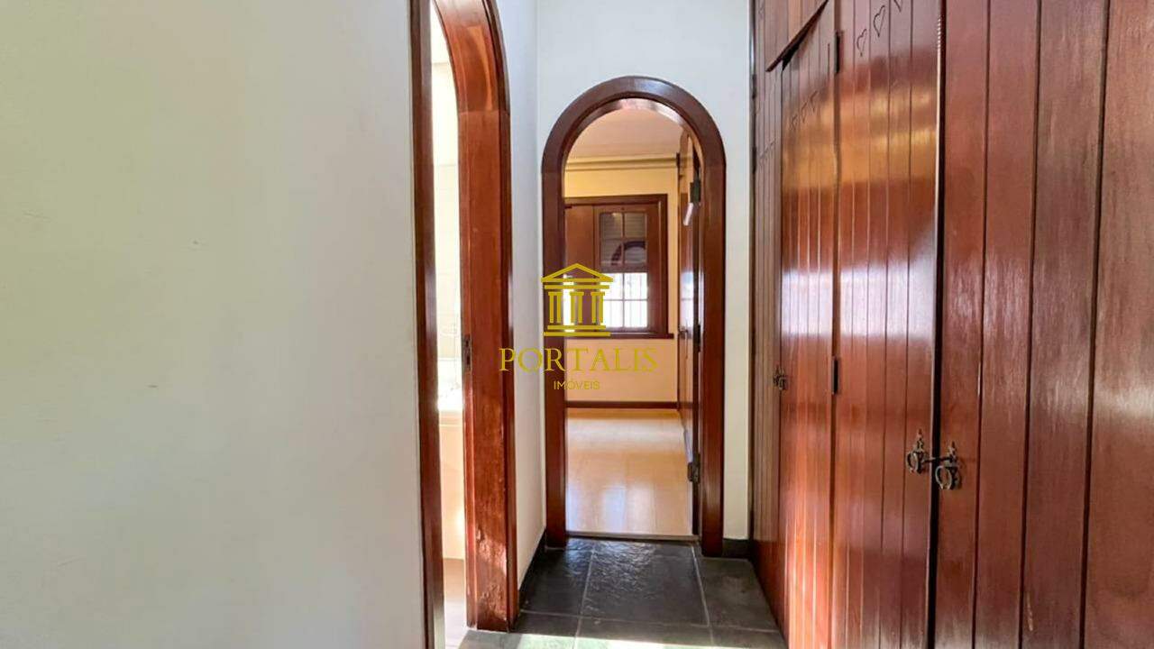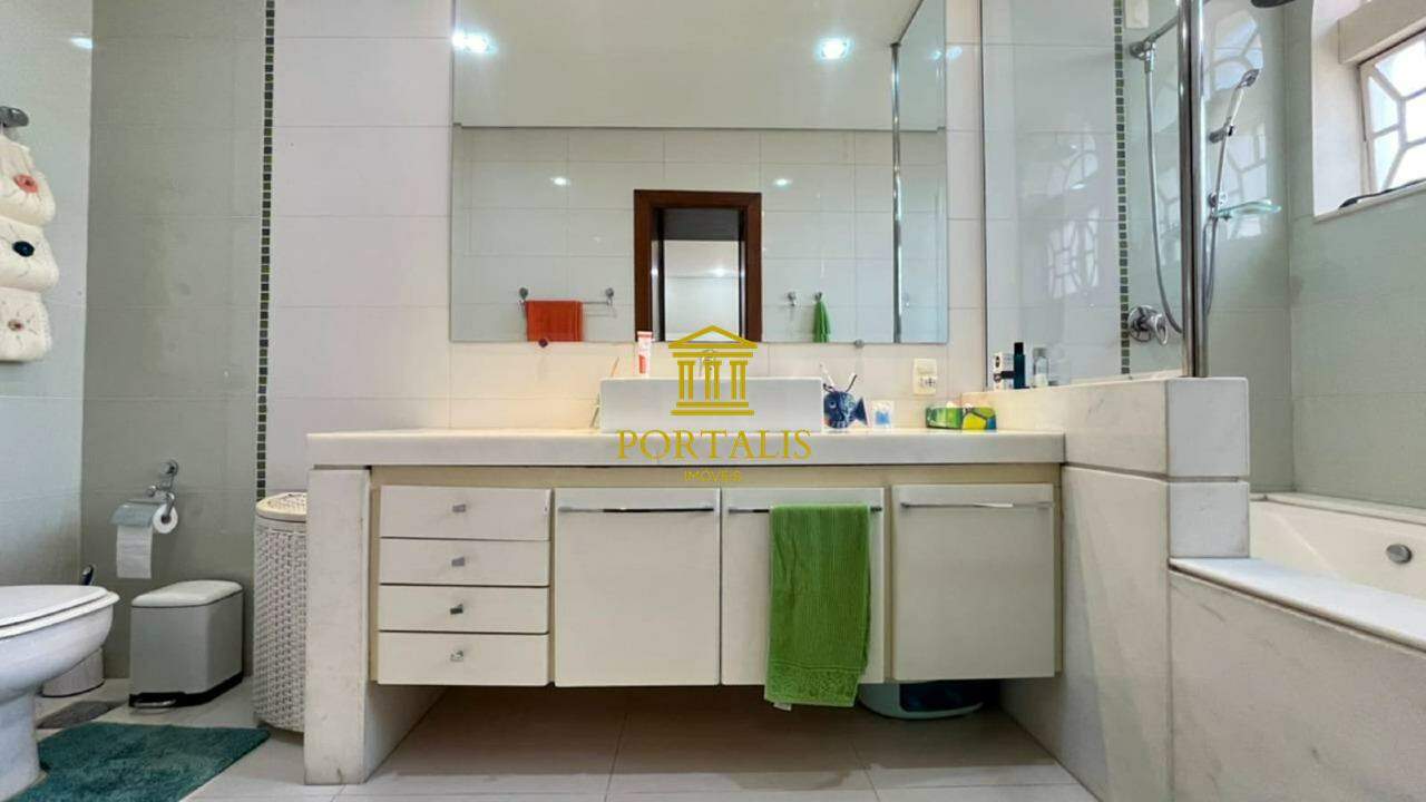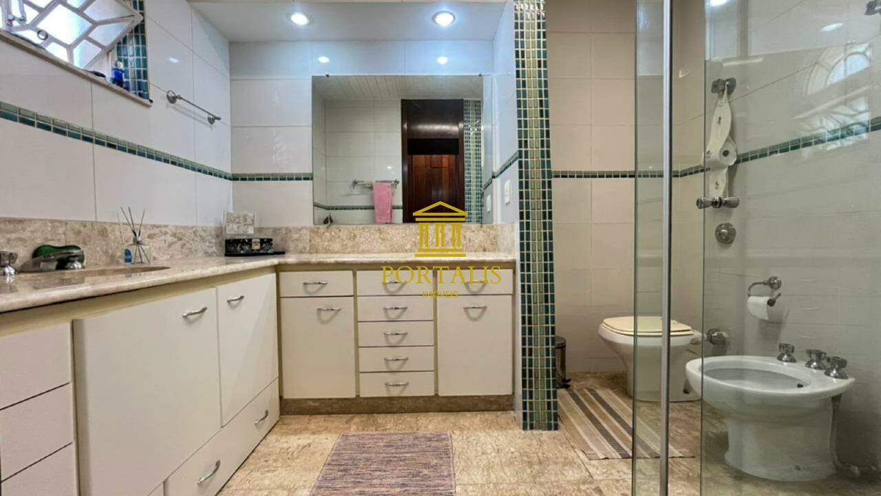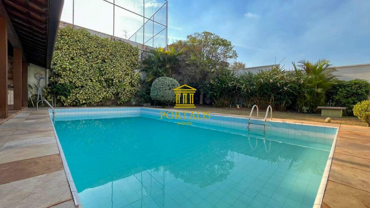 * Área total: 1.063m² * Sala ampla p/ 2 ambientes, com piso em tábua corrida * Sala de jantar com piso em ardósia * Varanda * 5 quartos c/ armários e iluminação decorativa: 3 suítes — uma com closet, outra com hidromassagem e ar-condicionado. * Banheiro social com piso e bancada em mármore, espelho decorativo e box blindex. * Cozinha espaçosa c/ armários, bancada e piso em granito. * Despensa * Escritório com piso em ardósia * Jardim de inverno, que realça a iluminação natural. * Área de serviço com lavanderia * DCE * 3 vagas de garagem cobertas * Espaço gourmet completo, adega; piscina e quintal amplo.